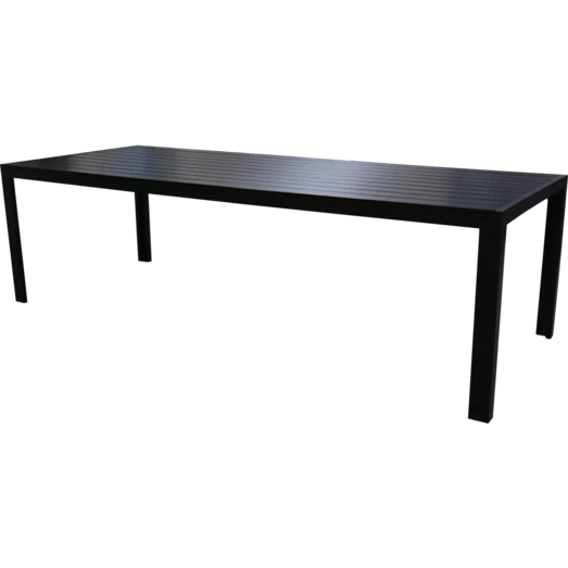 Skab en hyggelig stemning på terrassen eller i haven med dette sorte Anholt havebord, hvor der er plads til både store og små forsamlinger. Havebordet er fremstillet i vedligeholdelsesvenligt nonwood materiale med sorte lameller og sort aluminiumsstel, der giver et råt og elegant udtryk.