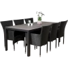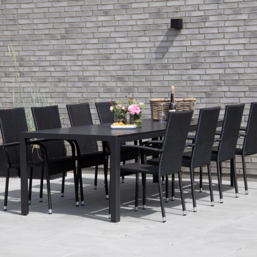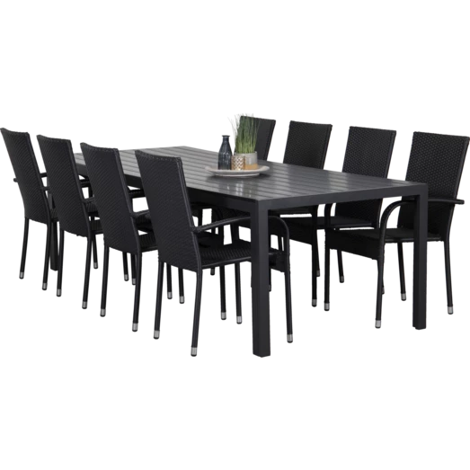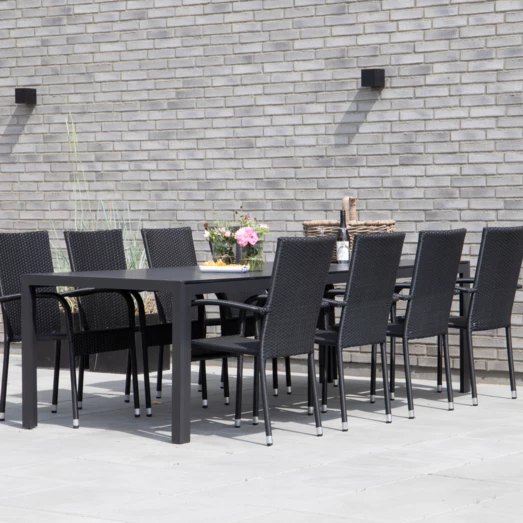 Ffremstillet i vedligeholdelsesvenlige materialer får du her et havemøbelsæt bestående af Anholt havebord med sortlakeret aluminiumsstel og sorte nonwood lameller. Hertil 8 Galway havestole i sort 4-string polyrattan med stel i aluminium. Havestolen er godkendt op til 110 kg og kan stables.