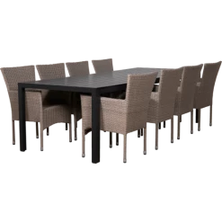 Havemøbelsættet består af Anholt havebord med stel i sortlakeret aluminium og sorte nonwood lameller. Hertil 8 naturfarvet Bima havestole med 2-string polyrattan og stålstel, som er godkendt til op til 110 kg. Havestolen kan stables, så den er nem at opbevare i vinterhalvåret.