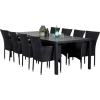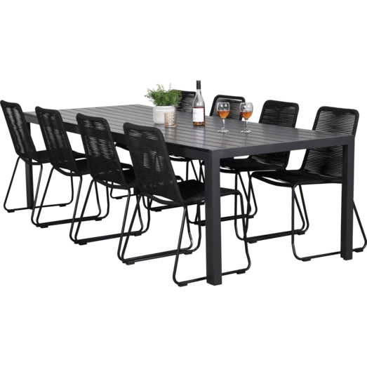 Havemøbelsættet består af Anholt havebord med sorte nonwood lameller og stel i sortlakeret aluminium. Hertil 8 Nyby havestole, som er utroligt behagelige at sidde i, takket være stolens design og materialevalg i stolens sæde og ryg, der former sig efter din krop. Havestolens reb er UV-beskyttet og stellet er i sortlakeret stål.