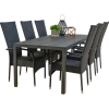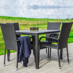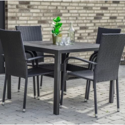 Havemøbelsæt med et firkantet havebord skaber et skarpt men flot udtryk, der egner sig godt til både terrassen eller i haven. Havebordet er fremstillet af sorte vedligeholdelsesvenlige nonwood planker og med tilhørende sortlakeret aluminiumsstel. Til bordet medfølger Dublin havestole produceret i 4-string polyrattan og med stel i sort stål, hvilket gør den nem at vedligeholde og rengøre. Havestolen er godkendt til op til 110 kg og kan stables, hvilket gør den nem at opbevare hvis vejret ikke tillader hygge på terrassen eller når sæsonen skifter.