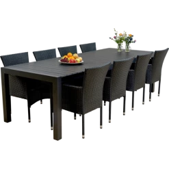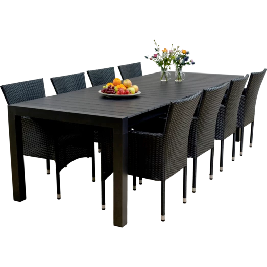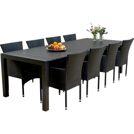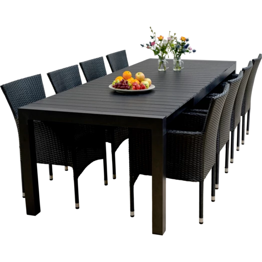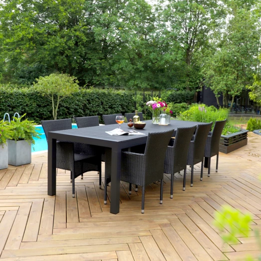 Flot havesæt med Calvi havebord med sort nonwood bordplade og tilhørende sortlakeret aluminiumsstel, som giver et elegant men funktionelt udtryk. Havebordet er med udtræk i den ene ende, som giver god plads til at kunne samle flere omkring havebordet. Der medfølger Bali havestole i sort 4-string polyrattan og stålstel, hvilket gør stolen nem at vedligeholde og rengøre. Havestolen er godkendt op til 110 kg og kan stables, så den er nem at opbevare hvis vejret ikke tillader hygge på terrassen eller når sæsonen skifter. Der medfølger komfortable grå havehynder med lynlås, som er vandafvisende og UV beskyttet.