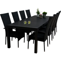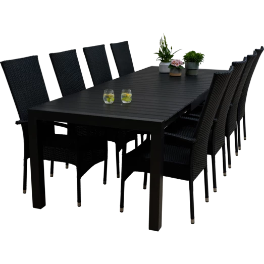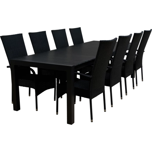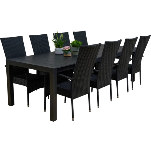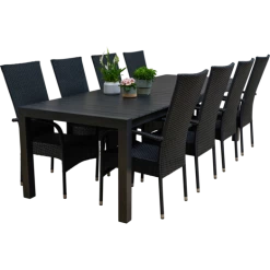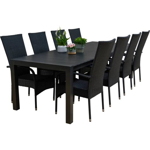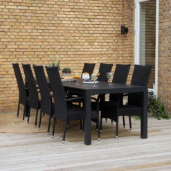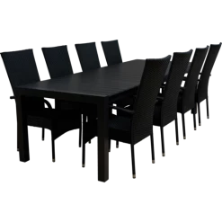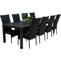 Flot havesæt med Calvi havebord med sort nonwood bordplade og tilhørende sortlakeret aluminiumsstel, som giver et elegant men funktionelt udtryk. Havebordet er med udtræk i den ene ende, som giver god plads til at kunne samle flere omkring havebordet. Der medfølger havestole produceret i nonwood materialet polyrattan og stellet i sort stål, hvilket gør den nem at vedligeholde og rengøre. Korfu havestol er godkendt til op til 110 kg og kan stables, hvilket gør den nem at opbevare hvis vejret ikke tillader hygge på terrassen eller når sæsonen skifter. For ekstra komfort kan der tilkøbes havehynder, se vores udvalg her.