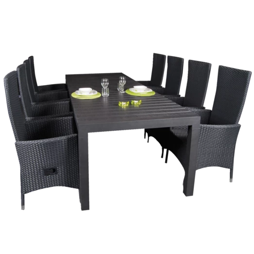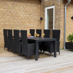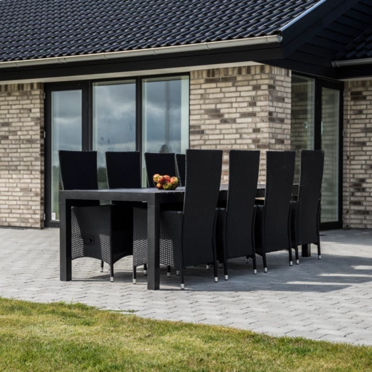 Flot havesæt med Calvi havebord med sort nonwood bordplade og tilhørende sortlakeret aluminiumsstel, som giver et elegant men funktionelt udtryk. Havebordet er med udtræk i den ene ende, som giver god plads til at kunne samle flere omkring havebordet. Der medfølger Samsø havestol produceret i sort nonwood materiale, 4-string polyrattan og stellet i sort aluminium, hvilket gør stolen meget nem at rengøre. Havestolen er godkendt til op til 110 kg. For ekstra komfort kan der tilkøbes havehynder, se vores udvalg her.