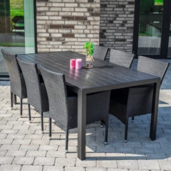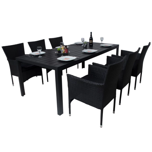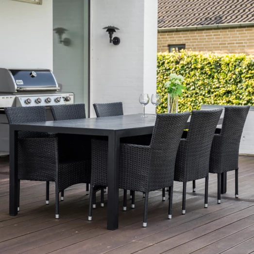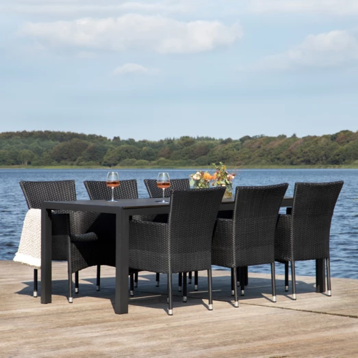 Egholm havebord er perfekt til både haver og terrasser, hvad end man er mange eller få. Fremstillet med sorte nonwood lameller og tilhørende sort aluminiumsstel er havebordet vedligeholdelsesvenligt og kan med fordel anvendes til både hverdag og festlige anledninger. Der medfølger Bali havestole i sort 4-string polyrattan og stålstel, hvilket gør stolen nem at vedligeholde og rengøre. Havestolen er godkendt op til 110 kg og kan stables, så den er nem at opbevare hvis vejret ikke tillader hygge på terrassen eller når sæsonen skifter. Der medfølger komfortable sorte havehynder med lynlås.
