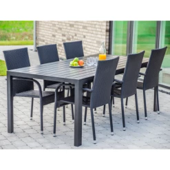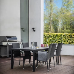 Egholm havebord er perfekt til både haver og terrasser, hvad end man er mange eller få. Fremstillet med sorte nonwood lameller og tilhørende sort aluminiumsstel er havebordet vedligeholdelsesvenligt og kan med fordel anvendes til både hverdag og festlige anledninger. Der medfølger Dublin havestole produceret i 4-string polyrattan og med stel i sort stål, hvilket gør den nem at vedligeholde og rengøre. Dublin havestol er godkendt til op til 110 kg og kan stables, hvilket gør den nem at opbevare hvis vejret ikke tillader hygge på terrassen eller når sæsonen skifter. For ekstra komfort kan der tilkøbes havehynder, se vores udvalg her.