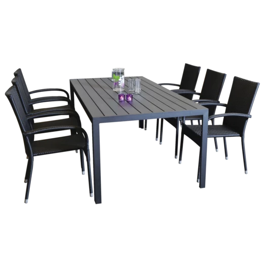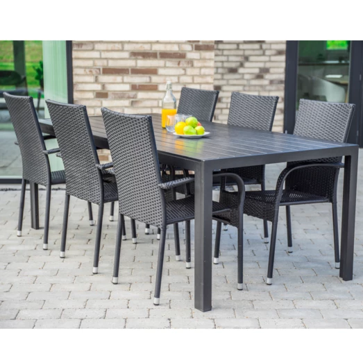 Egholm havebord er perfekt til både haver og terrasser, hvad end man er mange eller få. Fremstillet med sorte nonwood lameller og tilhørende sort aluminiumsstel er havebordet vedligeholdelsesvenligt og kan med fordel anvendes til både hverdag og festlige anledninger. Der medfølger Galway havestol produceret i 4-string polyrattan og stellet i aluminium, hvilket gør den nem at rengøre og vedligeholde. Denne havestol er godkendt til op til 110 kg og kan stables, hvilket gør den nem at opbevare hvis vejret ikke tillader hygge på terrassen eller når sæsonen skifter.
