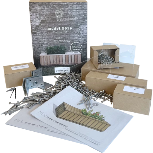 ARKI kittet Model 0619 indeholder arkitekttegnet vejledninger, skruer, beslag, bits og bor, så du kan bygge din egen planteplint. Træ og planteindsats købes separat, og dimensioner og mængder fremgår af kittets vejledning.