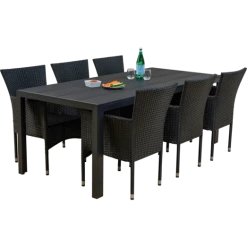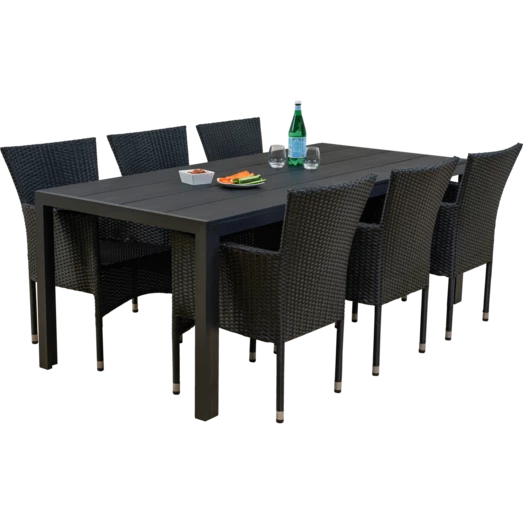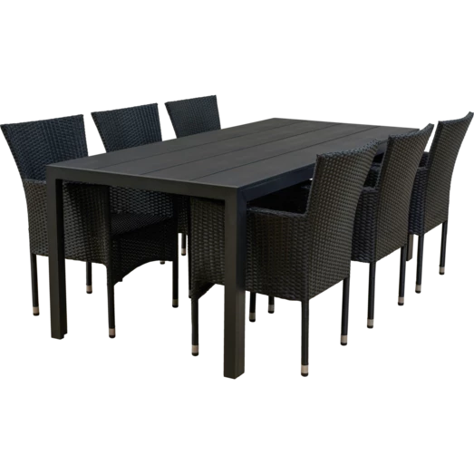 Guldborg havebordet er fremstillet med 4 sorte brede lameller i vedligeholdelsesvenligt nonwood og tilhørende sort aluminiumsstel. Den solide konstruktion gør havebordet velegnet til både hverdage og sommerfester. Hertil medfølger 6 Bali havestole i sort 4-string polyrattan og sort stål stel, hvilket gør den nem at vedligeholde og rengøre. Havestolen er godkendt til op til 110 kg og kan stables.