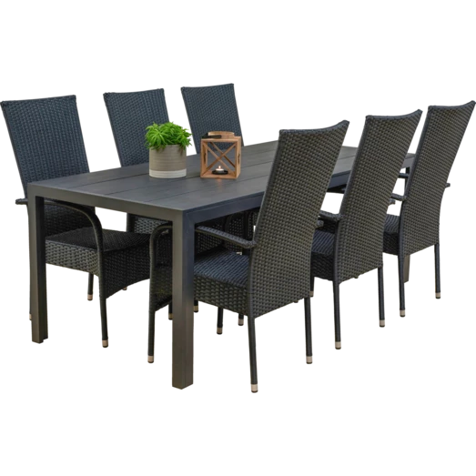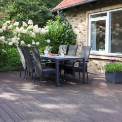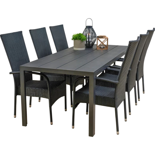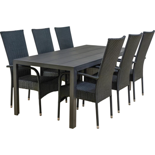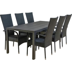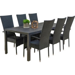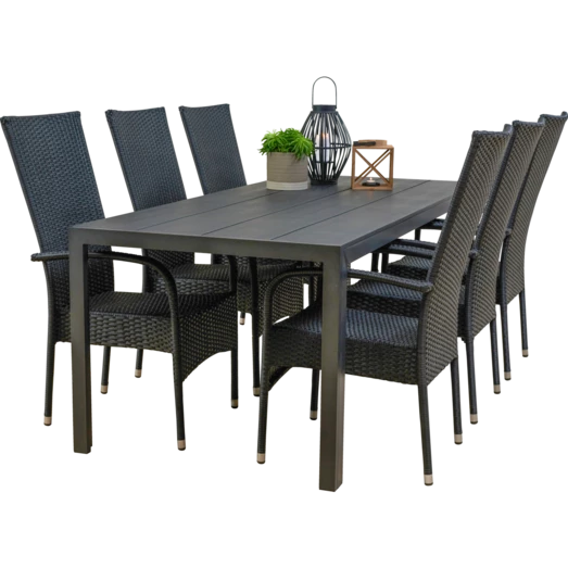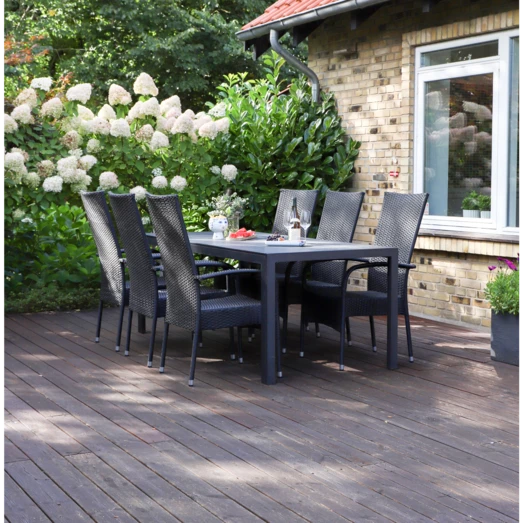 Guldborg havebordet er fremstillet med 4 sorte brede lameller i vedligeholdelsesvenligt nonwood og tilhørende sort aluminiumsstel. Den solide konstruktion gør havebordet velegnet til både hverdage og sommerfester. Der medfølger havestole produceret i 4-string polyrattan og sort stålstel, hvilket gør den nem at vedligeholde og rengøre. Korfu havestol er godkendt til op til 110 kg og kan stables, hvilket gør den nem at opbevare hvis vejret ikke tillader hygge på terrassen eller når sæsonen skifter.
