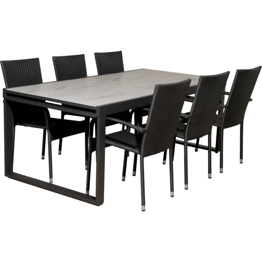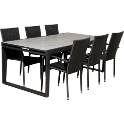 Til havemøbelsættet medfølger 6 Galway havestole fremstillet i sort 4-string polyrattan og med sort aluminiumsstel, hvilket gør den nem at rengøre og vedligeholde. Havestolen er godkendt op til 110 kg og kan stables, så havestolen nemt kan opbevares, hvis vejret ikke tillader hygge på terrassen eller når sæsonen skifter. For ekstra komfort kan der tilkøbes havehynder sættet, se vores udvalg her.
