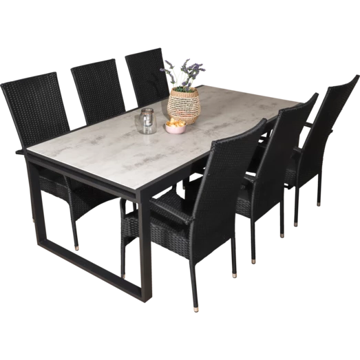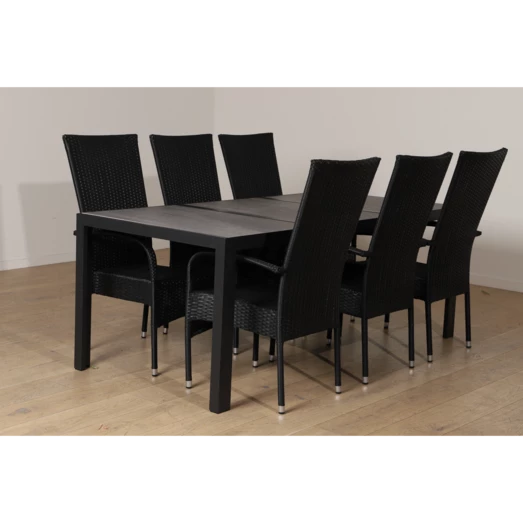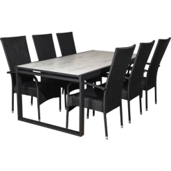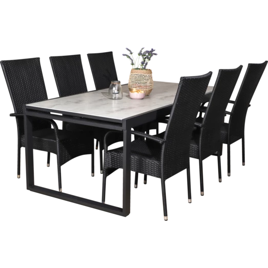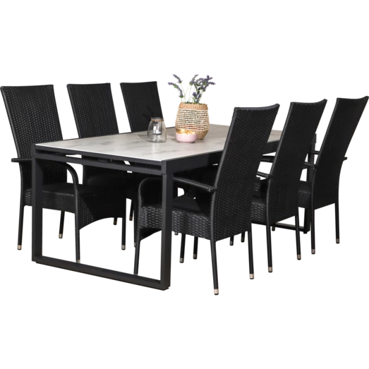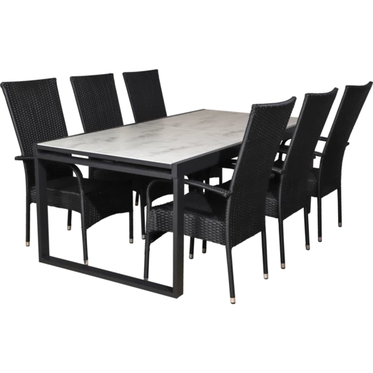 Til havemøbelsættet medfølger 6 Korfu havestol med høj ryg fremstillet i vedligeholdelsesvenligt sort 4-string polyrattan med tilhørende stålstel. Havestolen er godkendt op til 110 kg og kan stables, hvilket gør den nem at opbevare hvis vejret ikke tillader hygge på terrassen eller når vinterhalvåret nærmer sig. Find inspiration til havehynder her, som vil give ekstra god komfort til Korfu havestol.