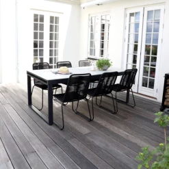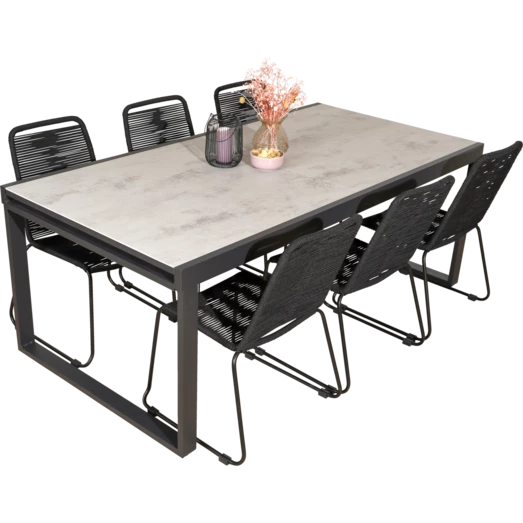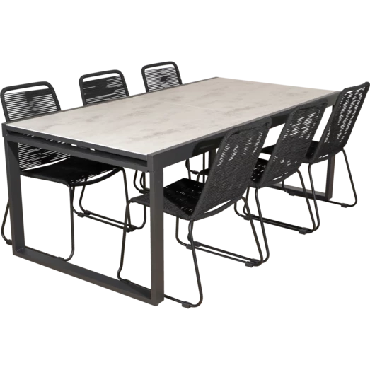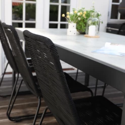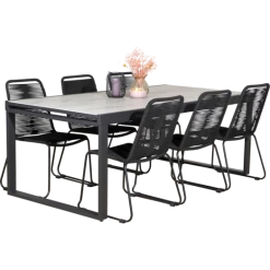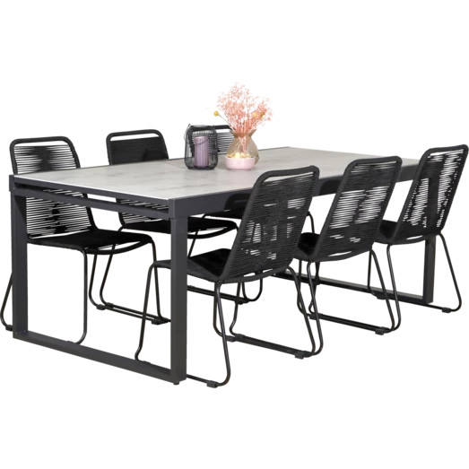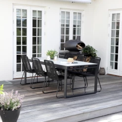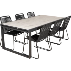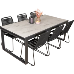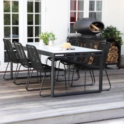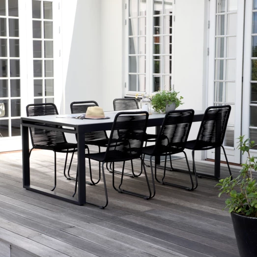 Til havemøbelsættet medfølger 6 Nyby havestole, som er utroligt behagelige at sidde i, takket være stolens design og materialevalg i stolens sæde og ryg, der former sig efter din krop. Havestolens reb er UV-beskyttet og stellet er i sortlakeret stål. Find inspiration til, hvilke haveborde Nybo havestol kan sammensættes med her.