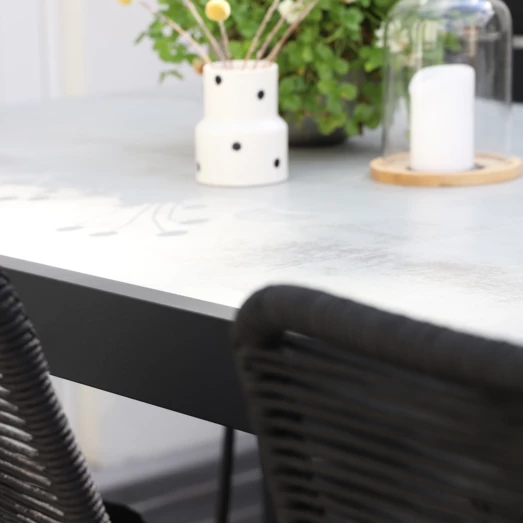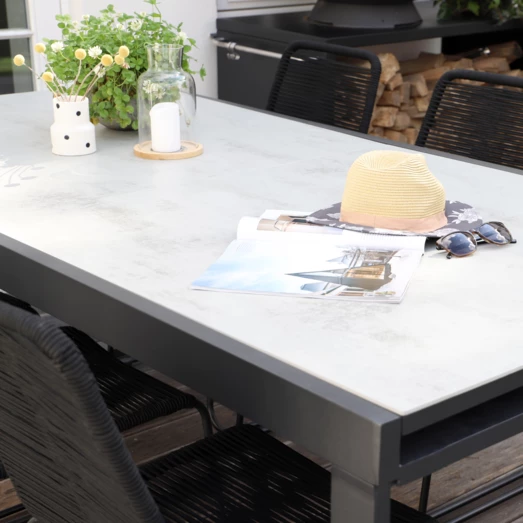 Haveborde fremstillet i polystone behøver kun minimalt vedligehold. Det anbefales at rengøre havebordet med en fugtig klud og opbevare bordet indenfor i et tørt og ventileret rum i vinterhalvåret for at forlænge holdbarheden.