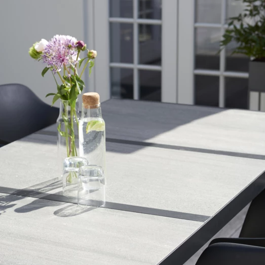 Skab et inspirerende udendørsmiljø på terrassen eller i haven med dette havebord, der indbyder til mange hyggelige fællesspisninger i aftensolen med både familie og venner. Fremstillet med gråmelerede keramikplader og sort aluminiumsstel er Liseleje et havebord, der giver et frisk pust og skiller sig ud fra mængden.