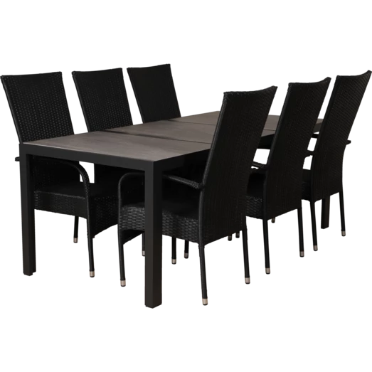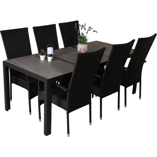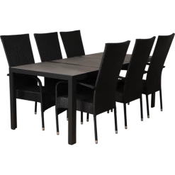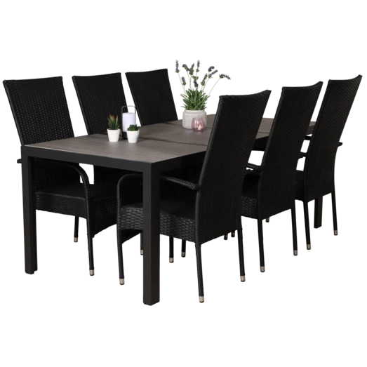Flot Liseleje havebord fremstillet med gråmelerede keramikplader og sort aluminiumsstel, der giver et frisk pust og skiller sig ud fra mængden. Til havemøbelsættet medfølger 6 Korfu havestol med høj ryg fremstillet i vedligeholdelsesvenligt sort 4-string polyrattan med tilhørende stålstel. Havestolen er godkendt op til 110 kg og kan stables.