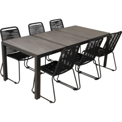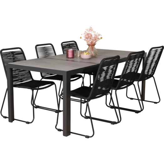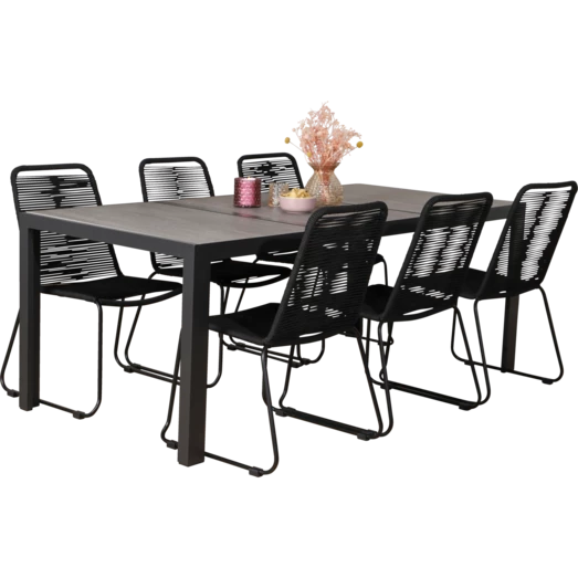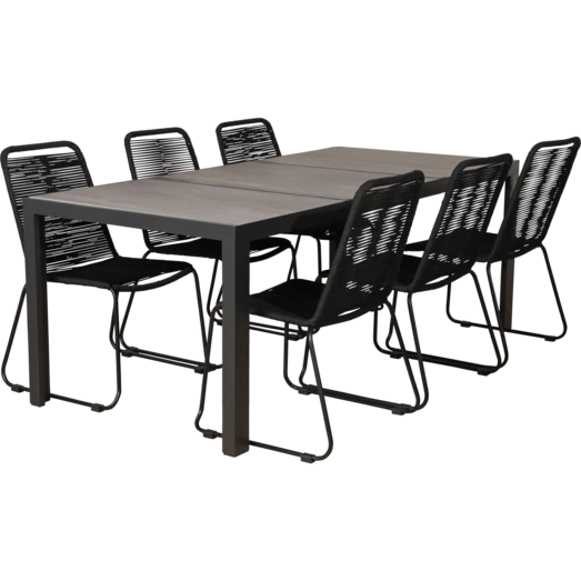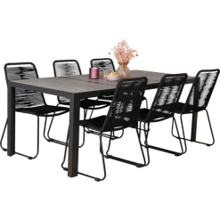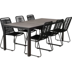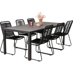 Flot Liseleje havebord fremstillet med gråmelerede keramikplader og sort aluminiumsstel, der giver et frisk pust og skiller sig ud fra mængden. Til havemøbelsættet medfølger 6 Nyby havestole, som er utroligt behagelige at sidde i, takket være stolens design og materialevalg i stolens sæde og ryg, der former sig efter din krop. Havestolens reb er UV-beskyttet og stellet er i sortlakeret stål. For ekstra komfort kan der tilkøbes havehynder, se vores udvalg her.