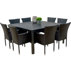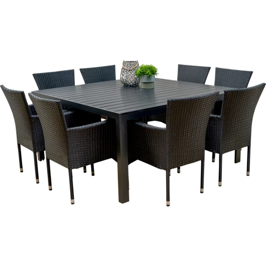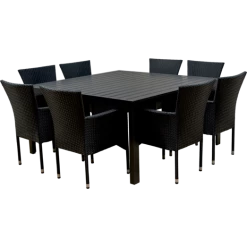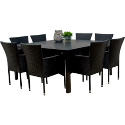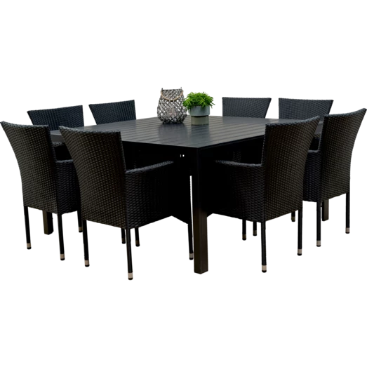 Munkebo havebord er et klassisk og enkelt havebord, der egner sig særligt godt til større terrasser og haver. Havebordet er udført i flot sort nonwood materiale, som er vedligeholdelsesvenligt og dertil et stilrent sort aluminiumsstel, som giver et råt look. Til havesættet medfølger 8 flotte Alba havestole i sort 4-strings polyrattan og aluminiumsstel, så stolene er nemme at rengøre og vedligeholde. Havestolen er godkendt op til 100 kg og kan stables.