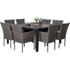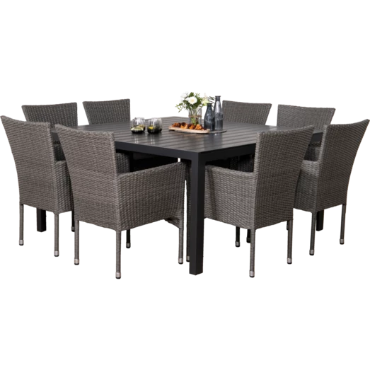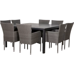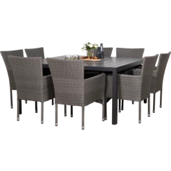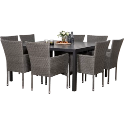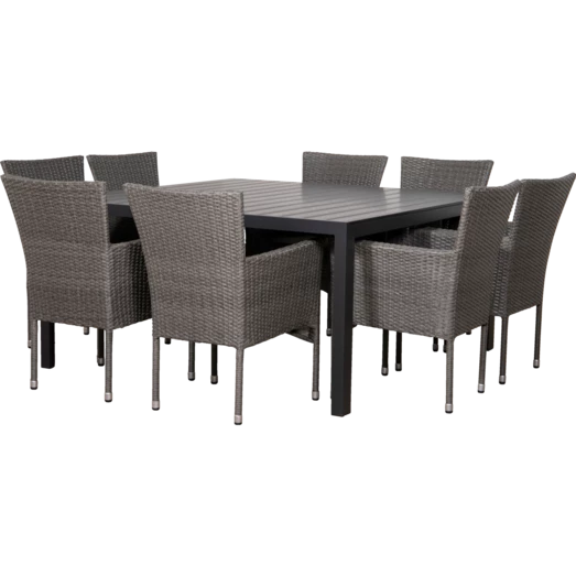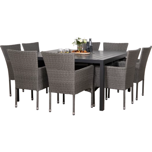 Munkebo havebord er et klassisk og enkelt havebord, der egner sig særligt godt til større terrasser og haver. Havebordet er udført i flot sort nonwood materiale, som er vedligeholdelsesvenligt og dertil et stilrent sort aluminiumsstel, som giver et råt look. Til dette havemøbelsæt medfølger 8 grå Bima havestole i 2-string polyrattan med stålstel, som er nemme at vedligeholde og rengøre. Bima havestol er godkendt til at bære op til 110 kg og kan stables.