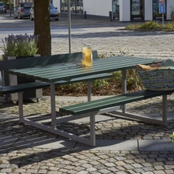 Nyder du at sidde i haven og nyde dens omgivelser, samtidig med at du ikke behøver afgive så meget plads og tænke på hvor stolene nu blev sat sidst? Her får du et elegant og enkelt bord-bænkesæt og kan rumme 6 personer.