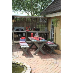 Nyder du at sidde i haven og nyde dens omgivelser, samtidig med at du ikke behøver afgive så meget plads og tænke på hvor stolene nu blev sat sidst? Her får du et elegant og enkelt bord-bænkesæt og kan rumme 6 personer.