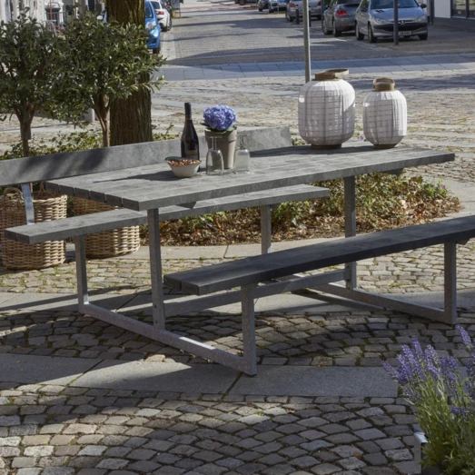 Nyder du at sidde i haven og nyde dens omgivelser, samtidig med at du ikke behøver afgive så meget plads og tænke på hvor stolene nu blev sat sidst? Her får du et elegant og enkelt bord-bænkesæt og kan rumme 6 personer.