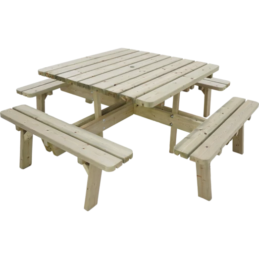 Dette bord/bænkesæt indbyder til at samle 8 fra familien/ venner, rundt om det firkantede bord. Her kan rammerne skabes for de hyggelige sommer stunder på terassen, hvor det firkantede bord/bænkesæt indbyder til snak og grin på kryds og tværs af bordet.