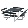 Dette bord/bænkesæt indbyder til at samle familien, rundt om det bordet. Her kan rammerne skabes for de hyggelige sommer stunder på terassen, hvor det firkantede bord/bænkesæt indbyder til snak og grin på kryds og tværs af bordet.