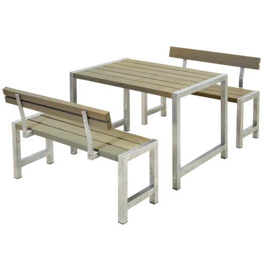 Bord/bænkesættet er fremstillet i naturlig nåletræ, som med det moderne og scandinaviske look , passer ind på de fleste danske terrasser.