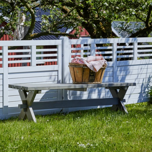 Nyd plankebænken på mange pladser i haven, den vil passe perfekt til udkigsområdet eller venteområdet. Desuden passer den til plankebordet på 177 cm. Det er en moderne plankebænk med sine massive planker på 42×116 mm. Bordet står solidt på de 42×116 massive træ fødder.
