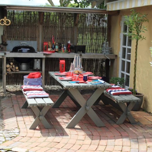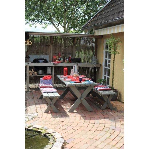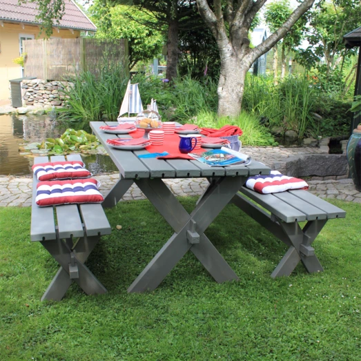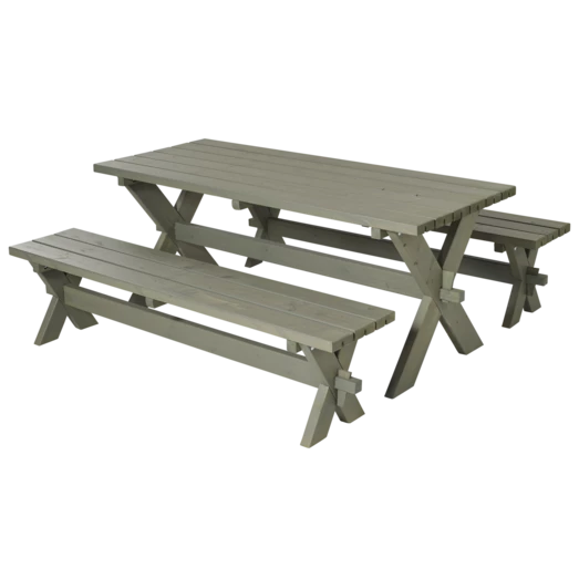 Nu kan du få et lækkert plankesæt i træ med massive nåletræsplanker på 42×116 mm. Sættet står solidt på de 42×116 / 42×90 mm massive træ fødder.