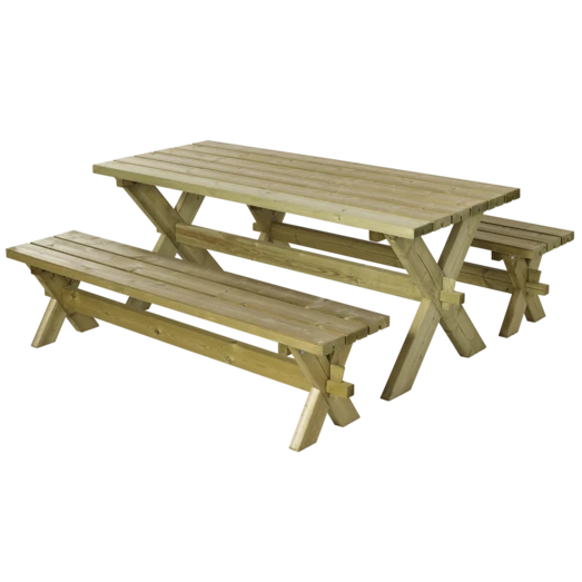 Nu kan du få et lækkert plankesæt i træ med massive nåletræsplanker på 42×116 mm. Sættet står solidt på de 42×116 / 42×90 mm massive træ fødder.