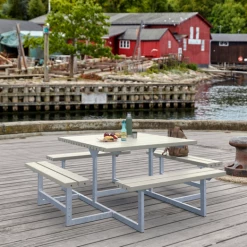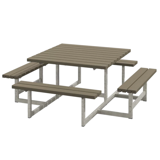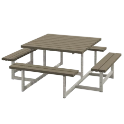 Ét bord-bænkesæt er det oplagte samlingspunkt i haven, hvor man kan se sig 360 grader omkring. Dermed kan du roligt lade børnerne lege i haven, mens I sidder roligt og nyder haven. Dette bord-bænkesæt er desuden det oplagte samtale bord, hvor man kan snakke på kryds og tværs og alle føler de er med i samtalen.