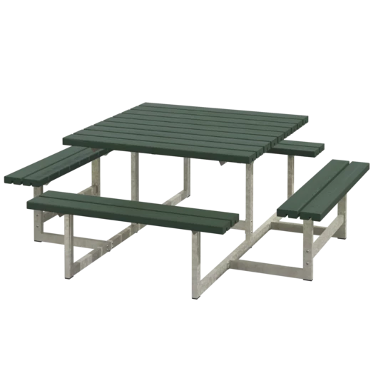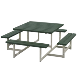 Ét bord-bænkesæt er det oplagte samlingspunkt i haven, hvor man kan se sig 360 grader omkring. Dermed kan du roligt lade børnerne lege i haven, mens I sidder roligt og nyder haven. Dette bord-bænkesæt er desuden det oplagte samtale bord, hvor man kan snakke på kryds og tværs og alle føler de er med i samtalen.