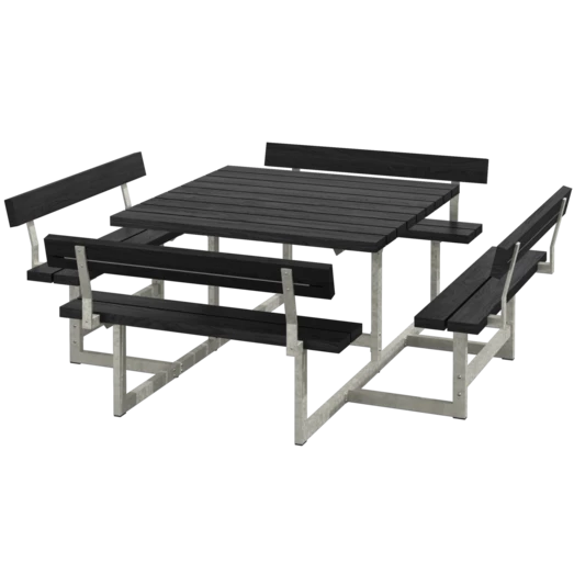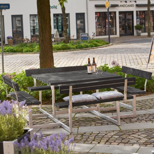 Dette bord/bænkesæt indbyder til at samvær, hyggelige og snaksagelige stunder i de udendøres omgivelser. Her kan rammerne skabes for de hyggelige sommer stunder på terassen, hvor det firkantede bord/bænkesæt indbyder til snak og grin på kryds og tværs af bordet.