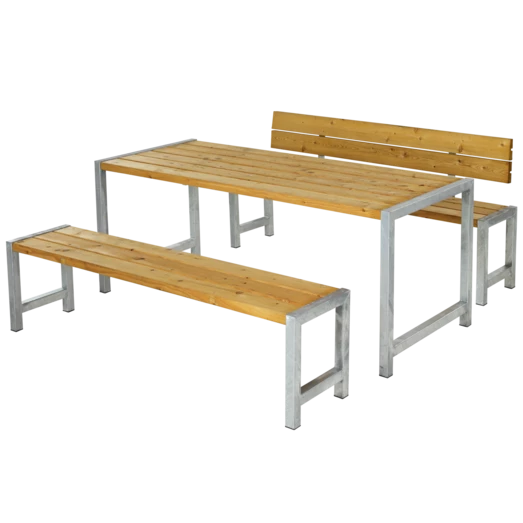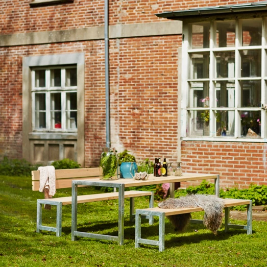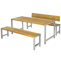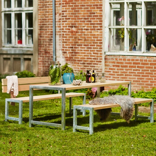 Dette bord/bænkesæt indbyder til at samle familien, rundt om det bordet. Her kan rammerne skabes for de hyggelige sommer stunder på terassen, hvor det firkantede bord/bænkesæt indbyder til snak og grin på kryds og tværs af bordet.