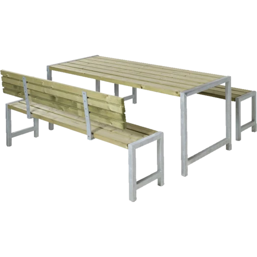 Dette bord/bænkesæt indbyder til at samle familien, rundt om det bordet. Her kan rammerne skabes for de hyggelige sommer stunder på terassen, hvor det firkantede bord/bænkesæt indbyder til snak og grin på kryds og tværs af bordet.