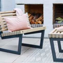 Med Siesta Trallestol, fremmstillet af mærkede traller i drivtømmerfarve, får du en rustik stol der skaber råhygge på varme sommeraftener. Til stolen findes også en matchende stol og bænk/bord samt hynder.