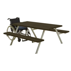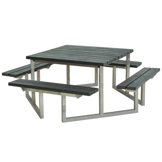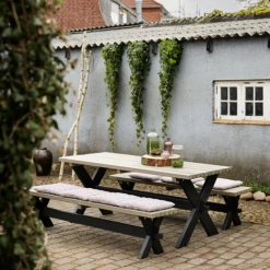 Spændende bord-bænkesæt med skrå ben, som skaber lidt stemning ind til sættet og giver det en skæv kant. Bord/bænkesæt indbyder til at samvær, hyggelige og snaksagelige stunder i de udendøres omgivelser. Her kan rammerne skabes for de hyggelige sommer stunder på terassen, hvor det firkantede bord/bænkesæt indbyder til snak og grin på kryds og tværs af bordet.