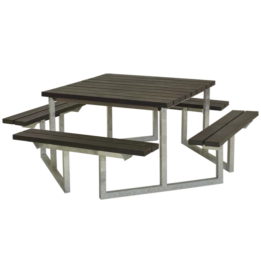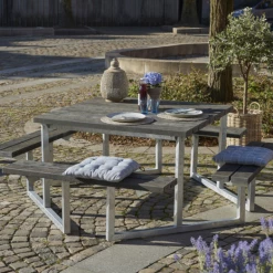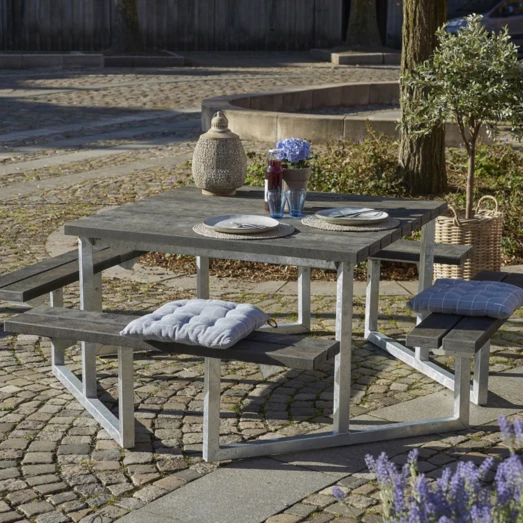 Spændende bord-bænkesæt med skrå ben, som skaber lidt stemning ind til sættet og giver det en skæv kant. Bord/bænkesæt indbyder til at samvær, hyggelige og snaksagelige stunder i de udendøres omgivelser. Her kan rammerne skabes for de hyggelige sommer stunder på terassen, hvor det firkantede bord/bænkesæt indbyder til snak og grin på kryds og tværs af bordet.