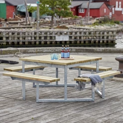 Spændende bord-bænkesæt med skrå ben, som skaber lidt stemning ind til sættet og giver det en skæv kant. Bord/bænkesæt indbyder til at samvær, hyggelige og snaksagelige stunder i de udendøres omgivelser. Her kan rammerne skabes for de hyggelige sommer stunder på terassen, hvor det firkantede bord/bænkesæt indbyder til snak og grin på kryds og tværs af bordet.