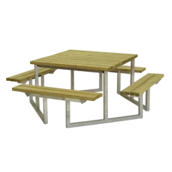 Spændende bord-bænkesæt med skrå ben, som skaber lidt stemning ind til sættet og giver det en skæv kant. Bord/bænkesæt indbyder til at samvær, hyggelige og snaksagelige stunder i de udendøres omgivelser. Her kan rammerne skabes for de hyggelige sommer stunder på terassen, hvor det firkantede bord/bænkesæt indbyder til snak og grin på kryds og tværs af bordet.