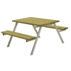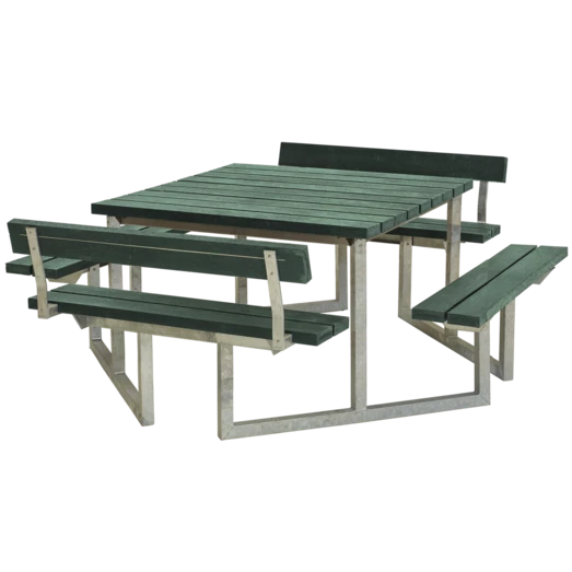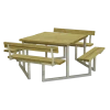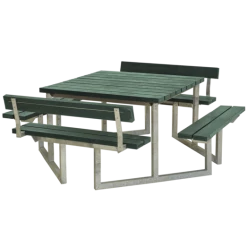 Spændende bord-bænkesæt med skrå ben, som skaber lidt stemning ind til sættet og giver det en skæv kant. Bord/bænkesæt indbyder til at samvær, hyggelige og snaksagelige stunder i de udendøres omgivelser. Her kan rammerne skabes for de hyggelige sommer stunder på terassen, hvor det firkantede bord/bænkesæt indbyder til snak og grin på kryds og tværs af bordet.