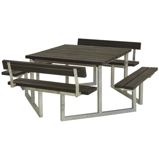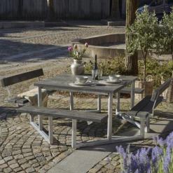 Spændende bord-bænkesæt med skrå ben, som skaber lidt stemning ind til sættet og giver det en skæv kant. Bord/bænkesæt indbyder til at samvær, hyggelige og snaksagelige stunder i de udendøres omgivelser. Her kan rammerne skabes for de hyggelige sommer stunder på terassen, hvor det firkantede bord/bænkesæt indbyder til snak og grin på kryds og tværs af bordet.