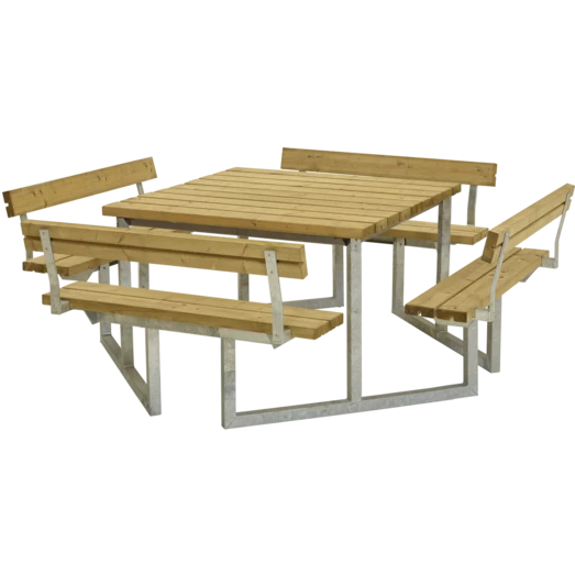 Spændende bord-bænkesæt med skrå ben, som skaber lidt stemning ind til sættet og giver det en skæv kant. Bord/bænkesæt indbyder til at samvær, hyggelige og snaksagelige stunder i de udendøres omgivelser. Her kan rammerne skabes for de hyggelige sommer stunder på terassen, hvor det firkantede bord/bænkesæt indbyder til snak og grin på kryds og tværs af bordet.