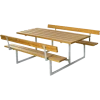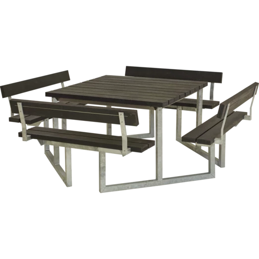 Spændende bord-bænkesæt med skrå ben, som skaber lidt stemning ind til sættet og giver det en skæv kant. Bord/bænkesæt indbyder til at samvær, hyggelige og snaksagelige stunder i de udendøres omgivelser. Her kan rammerne skabes for de hyggelige sommer stunder på terassen, hvor det firkantede bord/bænkesæt indbyder til snak og grin på kryds og tværs af bordet.