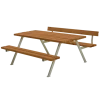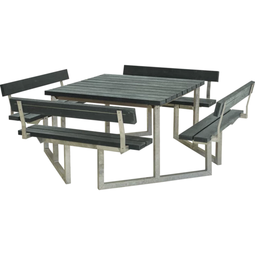 Spændende bord-bænkesæt med skrå ben, som skaber lidt stemning ind til sættet og giver det en skæv kant. Bord/bænkesæt indbyder til at samvær, hyggelige og snaksagelige stunder i de udendøres omgivelser. Her kan rammerne skabes for de hyggelige sommer stunder på terassen, hvor det firkantede bord/bænkesæt indbyder til snak og grin på kryds og tværs af bordet.