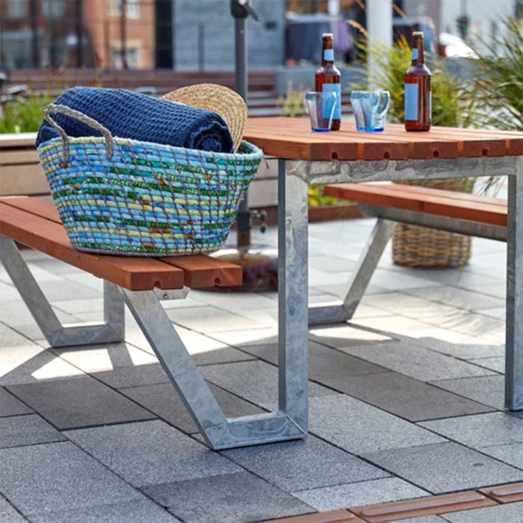 Dette bord/bænkesæt indbyder til at samvær, hyggelige og snaksagelige stunder i de udendøres omgivelser. Her kan rammerne skabes for de hyggelige sommer stunder på terassen, hvor det firkantede bord/bænkesæt indbyder til snak og grin på kryds og tværs af bordet.