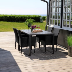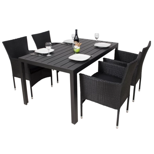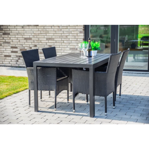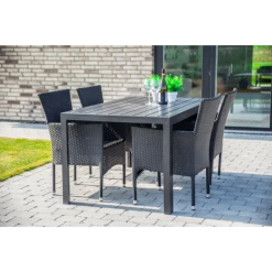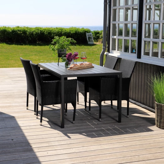 Sandro havebord er for dig, der ønsker et klassisk havebord, der ikke går på kompromis med kvalitet og funktionalitet. Havebordet er fremstillet af vedligeholdelsesvenlige sorte nonwood struktur planker og tilhørende sort aluminiumsstel, som giver et råt look. Til havesættet medfølger 4 flotte Alba havestole i sort 4-strings polyrattan og aluminiumsstel, så stolene er nemme at rengøre og vedligeholde. Havestolen er godkendt op til 100 kg og kan stables.