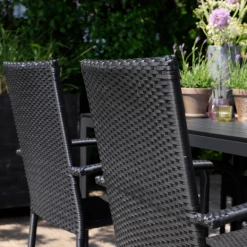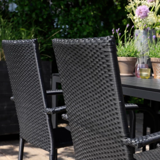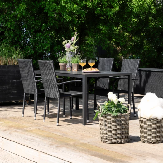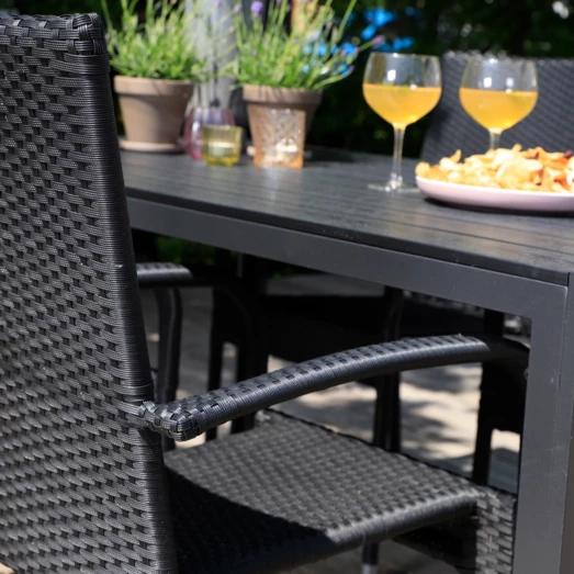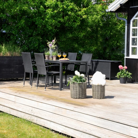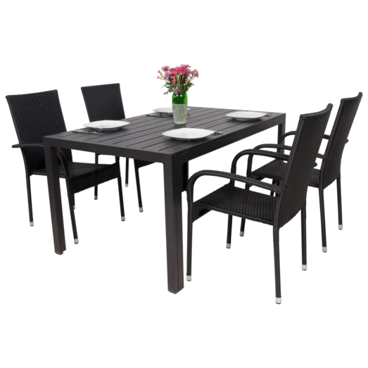 Sandro havebord er for dig, der ønsker et klassisk havebord, der ikke går på kompromis med kvalitet og funktionalitet. Havebordet er fremstillet af vedligeholdelsesvenlige sorte nonwood struktur planker og tilhørende sort aluminiumsstel, som giver et råt look. Der medfølger 4 Galway havestole i sort 4-string polyrattan og med sort aluminiumsstel, hvilket gør den nem at rengøre og vedligeholde. Havestolen er godkendt op til 110 kg og kan stables.
